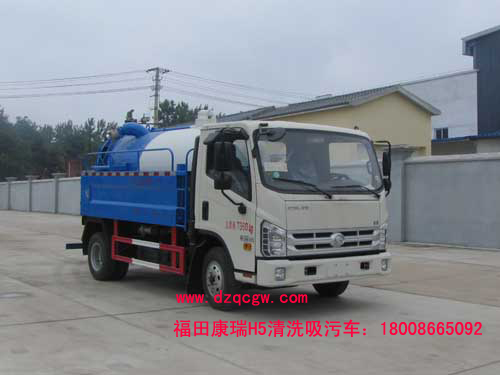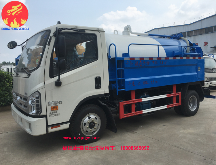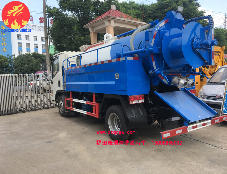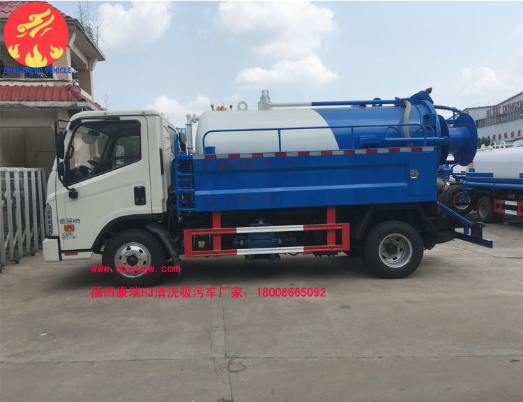底盤說明康瑞單排前翻駕駛室,3360mm軸距,全柴115馬力國五發動機,5檔,7.00R16鋼絲胎,動轉、ABS罐體外形尺寸(直段長×直徑)(mm):3200×1350(其中罐體前部1200mm為清水罐).污水罐介質:液態污物,密度800千克/立方米,載質量2100kg,罐體有效容積2.75立方米.清水罐介質:水,密度1000千克/立方米,載質量1500kg,罐體有效容積1.57立方米.兩罐不能同時滿載