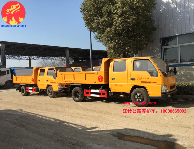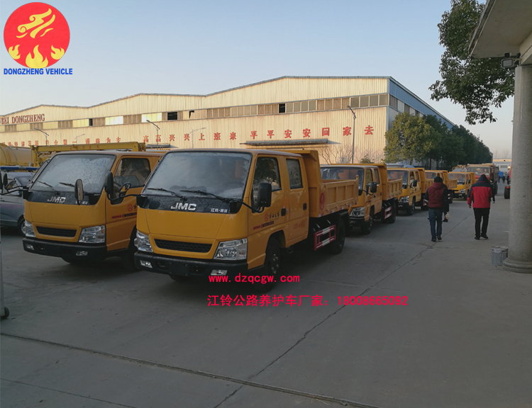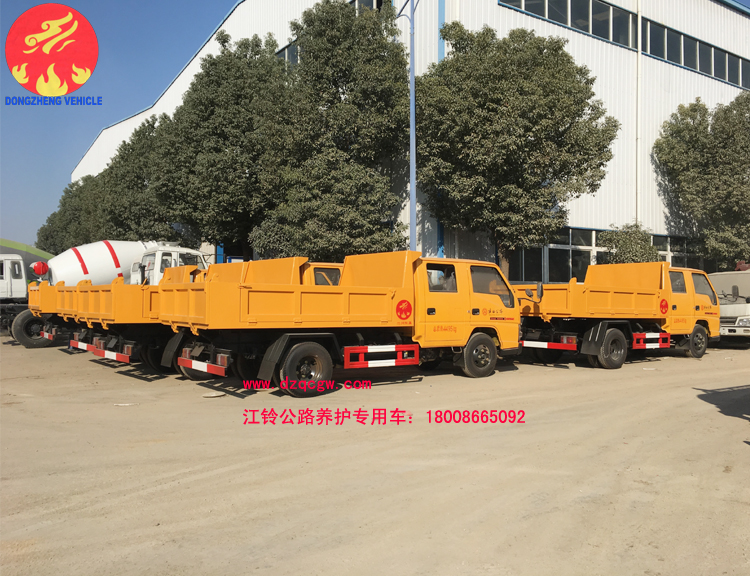 我公司生產的江鈴公路養護車是一款雙排座自卸車,該車實用性強,性價比高,是一款適用于公路養護作業的理想用車型。主要配置為江鈴雙排駕駛室,3360mm軸距,江鈴115馬力國五發動機,7.00R16LT鋼絲胎,油剎,5檔箱,排氣制動,原廠ABS。上裝部分主要由液壓系統、操作系統組成。舉升油缸為雙頂油缸,箱體標配邊3底4mm。