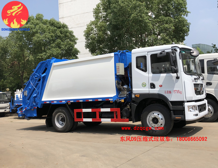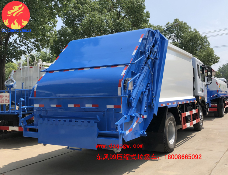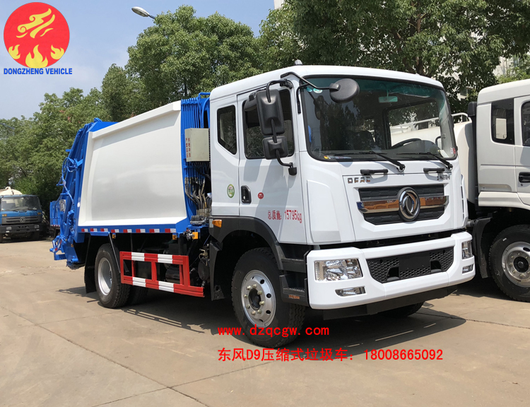 東風多利卡D9壓縮式垃圾車底盤為脂玉白,排半駕駛室,康明斯180馬力發動機,輪胎9.00-20 尼龍胎或鋼絲胎,中控、電動窗、ABS。