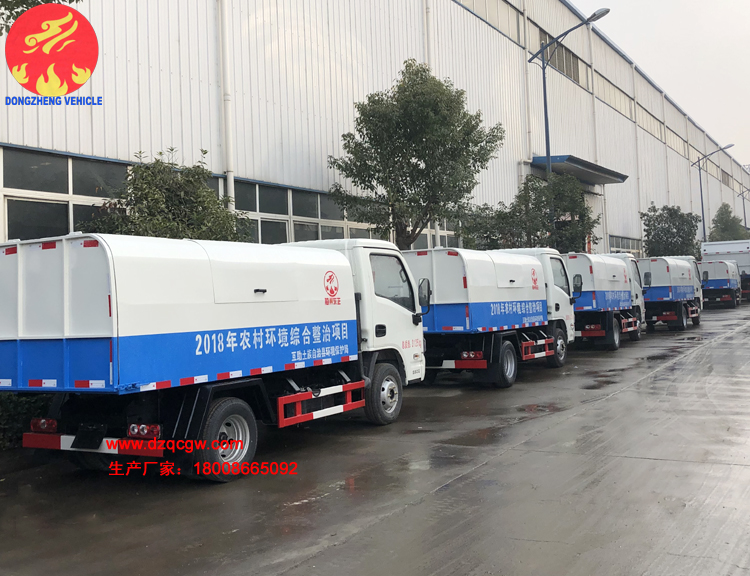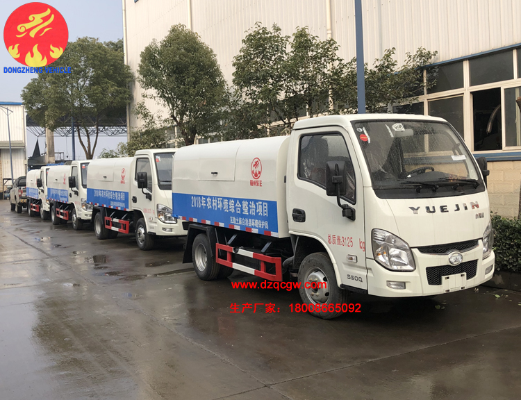 此批自卸式垃圾車采用躍進小卡國五單橋底盤,2650mm軸距,柳州五菱87馬力汽油發動機。箱體采用邊3底4,雙頂,箱體側門可打開,后卸。上藍牌,適合農村、街道、小區垃圾收集與轉運。