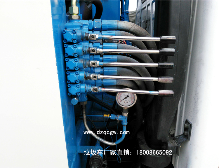 上裝說明: 廂體材料為武鋼優質炭鋼,厚度為邊5mm,廂體容積為5立方米。由裝料機構、壓縮機構、卸料機構、油泵、油箱、控制閥等組成的液壓機構組成。裝料機構由支架、連桿機構、凸輪、掛鉤等組成,在油缸作用下,將垃圾桶內的垃圾自動翻轉倒入料斗內。新款有9支液壓缸制動,不帶副壓板,液壓控制操作系統為電動控制和手動控制。