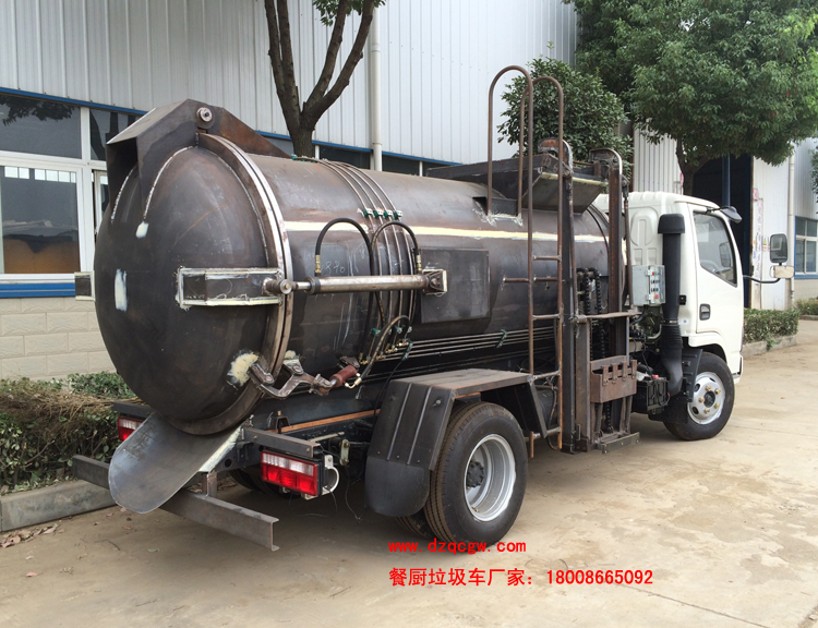 標準配置:圓形碳鋼罐體,罐體厚度5mm,拉桿提升機帶上蓋聯動;后蓋液壓開啟;罐體舉升自卸。選裝內軒推鏟卸料,帶渣液分享功能。餐廚垃圾車可分罐式和廂式。