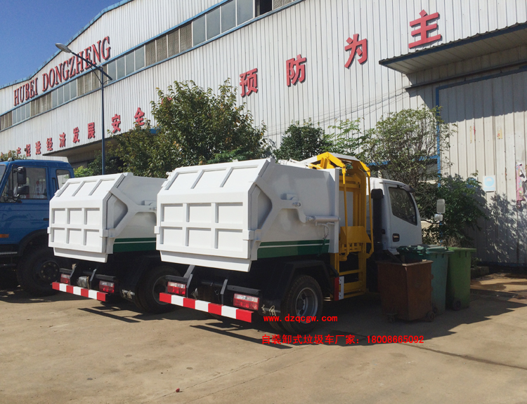 組成部分:上裝部分由密封式垃圾廂、液壓系統、操作系統組成。舉升油制缸(2支)垃圾廂可自吊上放下,上下一次工作循環時間≤50S。該掛桶式垃圾車的 特點是一個車能配幾十個垃圾廂,能實現一臺車與多個垃圾廂聯合作業,循環運輸,充分提高了車輛的運輸能力,特別適用于短途運輸,如環衛部門對城鎮垃圾的清 理、運輸等。