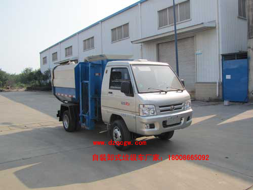 組成部分:上裝部分由密封式垃圾廂、液壓系統、操作系統組成。舉升油制缸(2支)垃圾廂可自吊上放下,上下一次工作循環時間≤50S。該掛桶式垃圾車的 特點是一個車能配幾十個垃圾廂,能實現一臺車與多個垃圾廂聯合作業,循環運輸,充分提高了車輛的運輸能力,特別適用于短途運輸,如環衛部門對城鎮垃圾的清 理、運輸等。