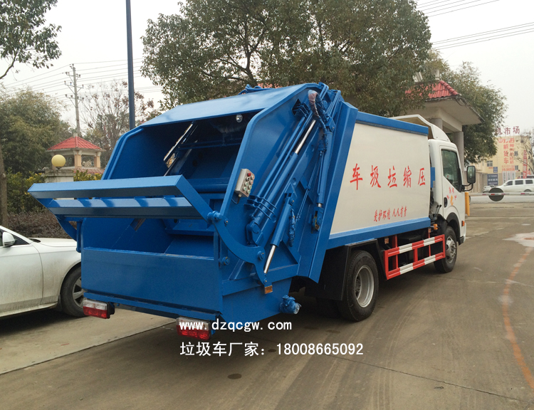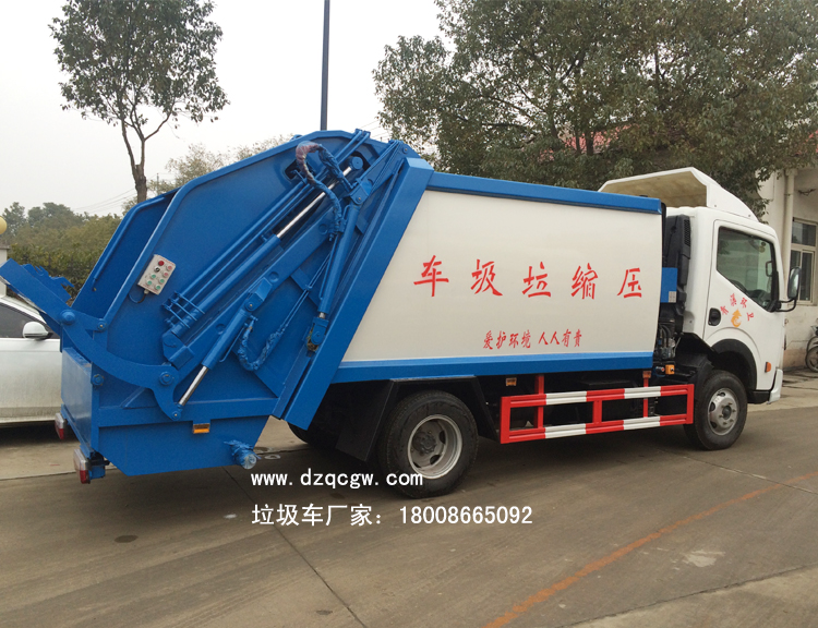 上裝說明: 廂體材料為武鋼優質炭鋼,厚度為邊5mm,廂體容積為5立方米。由裝料機構、壓縮機構、卸料機構、油泵、油箱、控制閥等組成的液壓機構組成。裝料機構由支架、連桿機構、凸輪、掛鉤等組成,在油缸作用下,將垃圾桶內的垃圾自動翻轉倒入料斗內。新款有9支液壓缸制動,不帶副壓板,液壓控制操作系統為電動控制和手動控制。